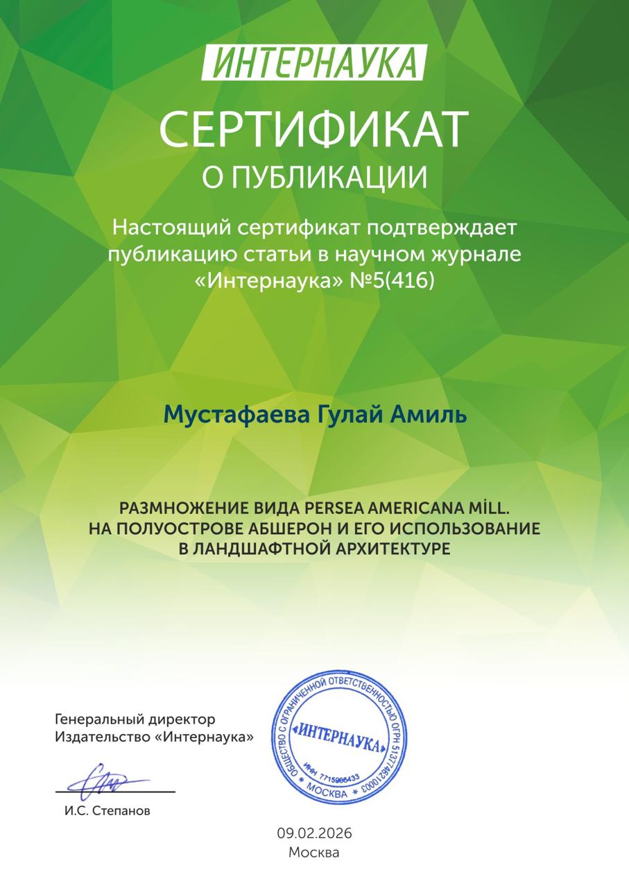 “Dendrologiya Bağı” publik hüquqi şəxsin (PHŞ) “Landşaft memarlığı və sistematika” laboratiyasının əməkdaşları tərəfindən Persea americana Mill. (avokado) növünün Abşeron yarımadasının torpaq-iqlim şəraitində çoxaldılması, introduksiya imkanları və landşaft kompozisiyalarında istifadəsinin öyrənilməsi istiqamətində aparılmış elmi-tədqiqat işlərinin nəticələrinin əks olunduğu “Размножение вида Persea americana Mill. на полуострове Абшерон и его использование в ландшафтной архитектуре” (Persea americana Mill. növünün Abşeron yarımadasında çoxadılması və landşaft memarlığında istifadəsi) adlı məqalə «Интернаука» beynəlxalq elmi jurnalının №5 (416) sayında dərc olunub.